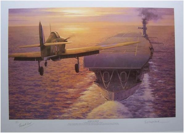| Moment of Truth by Keith Woodcock. The print depicts the moment as the first Hurricane of 46 squadron of the Royal Air Force, piloted by Sqn Ldr Kenneth Cross, without arrestor hooks or wires approaches the ill-fated carrier HMS Glorious. during the evacuation of Norway in June 1940. Bing later said We showed them they were wrong. The Fleet Air Arm pilots were delighted saying Marvellous bloody marvellous, now we will get them too. All had landed safely by 4.30am on June 8th. Signed limited edition of 350 prints. Image size 23 inches x 15 inches (58cm x 38cm). Price £115.00 Signed by Sir Kenneth Cross KCB, CBE, DSO, DFC (deceased). ITEM CODE DHM2404 Moment of Truth by Keith Woodcock. http://www.aviationartprints.com/keith_woodcock.htm |