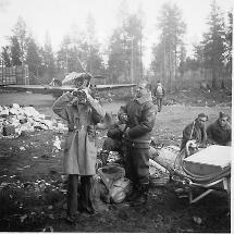 No. 46 (F) squadron pilots at Bardufoss on left is heap of empty 4 Imp. Gals. petrol tin cans. Possibly F/O H.H. Knight in duffel coat and using binoculars. Sitting behind on canvas bag is possibly Sgt. Lonsdale with parachute and possible flying suit on canvas bags in front. Standing seems to be Sgt. Earp zipping up his Irving sheepskin flight jacket and behind AM pump cart is Sergeant B.L. Taylor and Sergeant S. Andrew Andrew is easily identifiable from portrait printed on page 442 of “Battle of Britain Then and Now IV”. In background a pilot with Mae West life preserver over flight jacket is walking towards left wingtip of Hurricane having its engine worked on |
