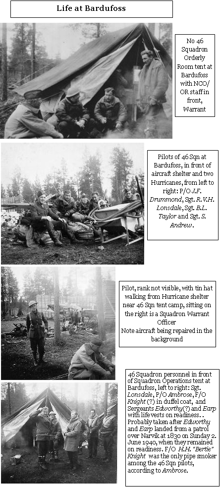 While I've been waiting for the signal to land Sergeant Taylor said his engine was running very rough and that he would have to land immediately. He made a perfect landing. I came in on the approach at just above stalling speed, feeling my way because the sandbag away down in the tail was affecting the flying characteristics of the aeroplane. Suddenly, as I was getting near the touchdown point, the Hurricane dropped rapidly and it seemed she was turning to land on the quarterdeck below the flight-deck! I slammed on full throttle and that beautiful, lovely Rolls-Royce Merlin engine never faltered. It dragged us up on to the flight deck and the Hurricane and I stopped a quarter of the way along it. When the wind flowing along the deck gets to the run-down it follows the downturn of the deck and causes a terrific down-draught. If you get too low on the approach and are caught in it you are pushed down, and if have not got mighty engine power and quick reactions - that's it. Of course, the Fleet Air Arm pilots were trained to cope with this by doing a fairly steep approach, thereby keeping above the down-draught. Anyway all three of us managed to get down all right and no one used more than three-quarters of the deck. ". Shortly after, seven more Hurricanes landed together with ten Gladiators from 263 Sqn. The Commander of Glorious was Captain Guy D'Oyly-Hughes. He was in a hurry to get home to start making preparations for a court-martial against his Commander of Flying. He received permissions to part company from the rest of the naval force and proceed to Scapa Flow escorted by two destroyers, leaving Ark Royal and her screen of destroyers behind. For unknown reasons Glorious did not use its Swordfish planes to patrol ahead and on the flanks. Glorious was intercepted and sunk by the battle-cruisers Scharnhorst and Gneisenau 200 miles of the Norwegian coast just north of the Arctic Circle. The destroyers were also sunk. Out of a total of over 1500 men only 41 survived. Jameson and Cross survived three days on a float before being rescued by a Norwegian ship. In their ten day Norwegian campaign 46 Sqn. flew 330 hours and 240 missions. They lost two of their 23 pilots in combat. Eight more pilots lost their lives in the Glorious tragedy. Three Hurricanes were shot down and three left behind at Bardufoss. The two damaged planes at Skånland were salvaged and brought home by ship. Sources and Acknowledgements: · RAF Operations Record Book, Forms 540 and 541 of No 46 Squadron. · "FLYALARM" by Ulf Larsstuvold, Bjorn Olsen, Bjorn Hafsten and Sten Stenersen. · "Jamie" Jameson · Interviews with locals in the Narvik area. · "Fledgling Eagles " by Christopher Shores, with John Foreman, Christian-Jacques Earnhardt, Heinrich Weiss and Bjorn Olsen · "Straight and Level " by ACM Sir Kenneth Cross with Professor Vincent Orange. · "Carrier Glorious " by John Winton. · Ovine Ellingson original article · The family of Fg Off Drummond for many of the pictures in this article |