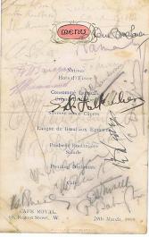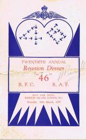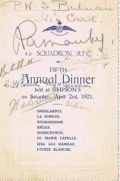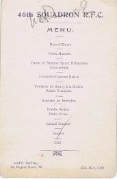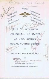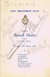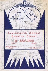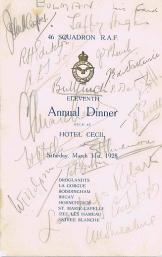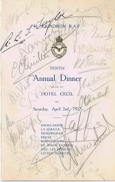 At the wedding of the first Commanding Officer, Major Babington, on January 1918 it was agreed to hold an annual reunion of Squadron aircrew. On the 15th of July that year, the officers met at the Grosvenor Hotel which was, technically, the first Reunion although tradition counts the wedding as the first. It matters not as you can only have one annual reunion a year! At the second Reunion in the Café Royal on the 29th of March 1919, it appears that the tradition of signing menu cards was begun. The date when an other tradition of sending out a “Call to Arms” was first instigated is uncertain but the first copy we have is dated 1926. Chaps Marchant and his successor as Secretary, Peter Gifkins, were extremely creative in producing Calls to Arms many of which reflected social or political issues of the time. Successors to these two stalwarts are very much duller and Calls to Arms after 1979 are straightforward information documents. The majority of pre-war menus and Calls to Arms were donated to the Association by the family of the late George Bullman (click here as well) in 2009. Below are copies of all the table plans and newsletters (Cheeeriooo) in the Association archives. The are quite a few missing menus and Calls to Arms, if you have any of the missing items, please either sent them to the Secretary for inclusion in the Reunion Scrapbook or send a jpeg copy by email. Indeed, if you have any memorabilia, then please contact the Secretary. Any contribution will be gratefully received and treasured. |