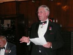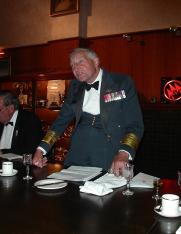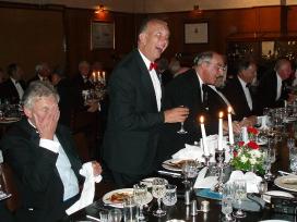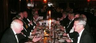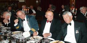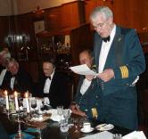 At the conclusion of the meal and before any speeches, the Mess staff will clear all plates and glasses other than a port glass. A decanter each of Port and Madeira is then positioned in front of the President and Mr Vice. When the President removes the decanter stoppers, Mr Vice does likewise. The President and Mr Vice then pass the decanters to their left. Each Member then charges his own glass to taste. A steward will be in attendance with a jug of water while the Port is being passed for those who prefer a non-alcoholic drink. Eventually the President’s set of decanters will reach Mr Vice, and Mr Vice’s the President, the stoppers are then replaced. (The decanters should never be passed back to the right). Extra decanters will be placed at regular points around the tables and it is important that these extra decanters are handled in the same way. The tradition that the decanter should not touch the table until it reaches its final destination is obscure and is not followed by No 46 Squadron. The stage is now set for the loyal toast. The President bangs his gavel and proclaims: “Mr Vice - The Queen”. Mr Vice then rises and replies: “Gentlemen - The Queen.” The assembly rises, and if a band is in attendance the National Anthem will be played. On completion of the anthem, glasses are lifted “The Queen” is repeated by the assemblage and the Port sipped. Seats are then resumed. If there are Members or guests from foreign or Commonwealth countries, toasts will be proposed to their head of state. The President will rise and propose the toast, for example, “Mr Vice - The President of the Federal Republic of Germany.” Mr Vice rises and replies: “Gentlemen, The President of the Federal Republic of Germany”. Again, all will rise, if a band is present it will play the appropriate anthem; otherwise, Members lift their glasses and repeat the toast. If a band is present then, after the loyal toast, the President will ask the band masters to join him and the Chef for a glass of port; this intended as a token of thanks on behalf of the Members.