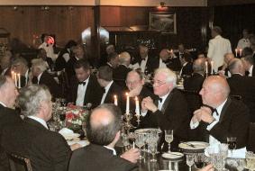 On completion of the loyal toast, coffee is served and the President recommences the circulation of the Port and Madeira decanters. Members will generally have had no need to touch the Mess silver during dinner; indeed a Member may be fined for so doing. However, if he has a burning need to read a particular inscription, it is generally permitted to touch the silver after the Loyal Toast. The President will usually announce an administrative break; Members who take advantage of the break must return to their seats with alacrity. On the return of all the Members, the President will, in turn, call upon the Secretary to make the Parish Announcements and nominated Members to propose toasts to ‘The Squadron’ and to ‘Absent Friends’. At the end of each proposal, all Members rise and drink the toast, repeating the exultation. Finally, the President will propose a toast to ‘Our Guests’; only the Members rise and drink this toast. To indicate the end of dinner, the President will bang his gavel and stand, the top table will rise and, led by the President, leave the dining room. During the exit, the remaining Members stand until all the top table have left. Other Members may then leave the dining room when they wish and later rejoin their colleagues in the anteroom for post-prandial refreshment and reminiscences.