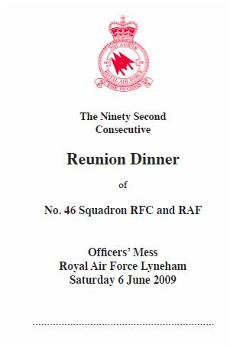 The Squadron is unique in the Royal Air Force because it is the only one to have held consecutive reunions through years of varying fortunes since the first in 1917. Reunions are held annually on the first Saturday in June under the banner of the No 46 squadron RFC & RAF Association. The Reunion Dinner is held on the Saturday night, normally in an Officers' Mess, with a separate function for the Ladies. The preferred dress is Mess Kit or Dinner Jacket although a dark lounge suit is perfectly acceptable. The cost of running the Association is met from a small additional charge on the cost of the dinner complemented by donations. A separate fund exists to assist members who are in financial difficulty to attend the reunion. Membership of the Association is open to all who have served on the posted strength of No 46 Squadron; in addition, people who have a close association with the Squadron may also be invited to join. If you would like to join the Association please email the Secretary , Group Captain Dougie Barr, at dougiebarr (@) gmail.com. After each Reunion, a newsletter is produced called “Cheeeriooo”; click here to see a copy of the latest issue, |