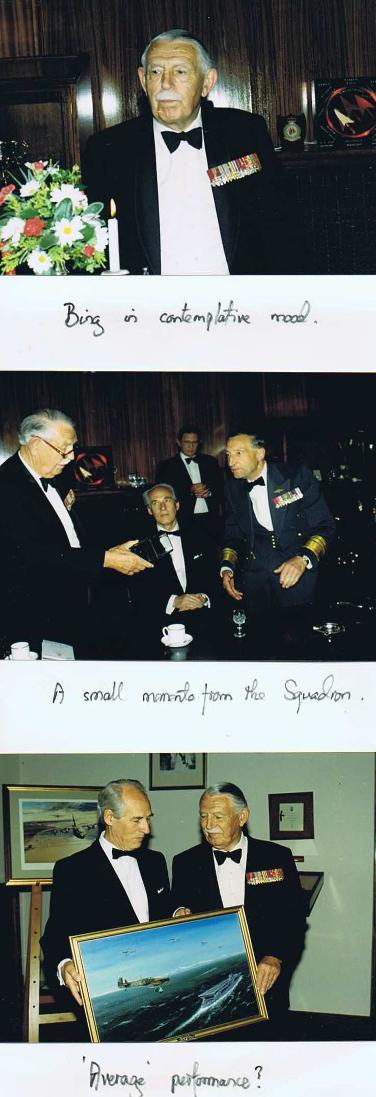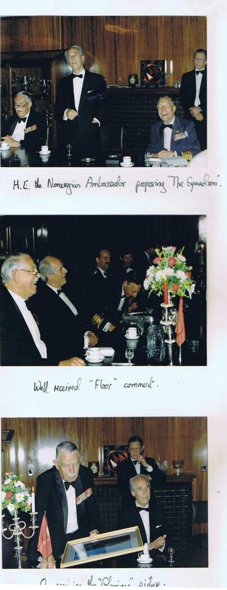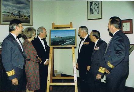 73rd Reunion RAF Lyneham 2 June 1990 Glorious Night HE the Norwegian Ambassador views a painting by Rusty Steele-Morgan showing the then Sqn Ldr Bing Cross (right) landing on HMS Glorious 0n 8 June 1940. The Ambassador’s wife, AVM David Crwys Williams, AM Sir Freddie Sowrey and the Association Secretary Sqn Ldr Mike Thatcher look on. |