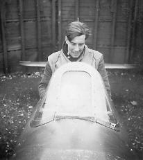 Flying Officer P.J.“Jack” Frost in Hurricane L1815 in wooden shelter at Bardufoss, following dogfight with a Ju 87 Stuka over Harstad, photographed after landing at 1540 hrs on Sunday 2. June 1940. Windscreen smashed by German bullet. With him is Drummond, camera in hand, . |
